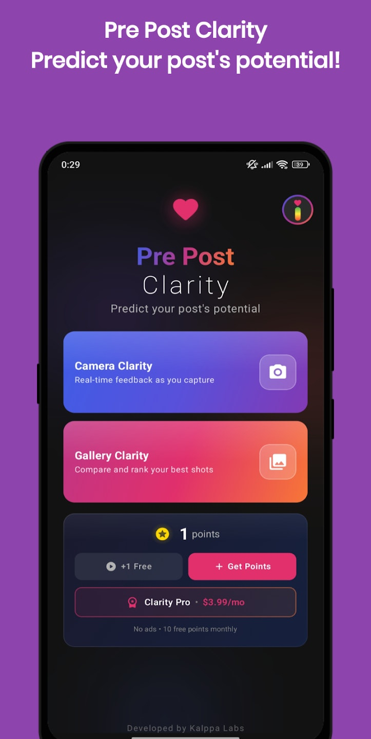 Descrição da ferramenta: Pre Post Clarity é uma aplicação que utiliza inteligência artificial no dispositivo para prever o desempenho de fotos antes da postagem, permitindo aos usuários selecionar as melhores imagens com maior potencial de engajamento.