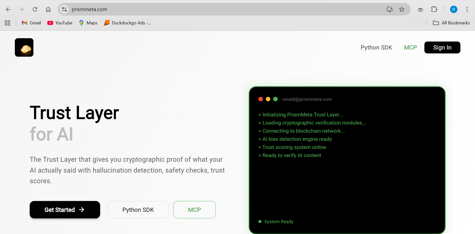 Descrição da ferramenta: PrismMeta é uma camada de confiança baseada em blockchain que verifica a autenticidade, detecta viés e garante transparência em conteúdos gerados por inteligência artificial, promovendo maior segurança e credibilidade nas informações produzidas por IA.