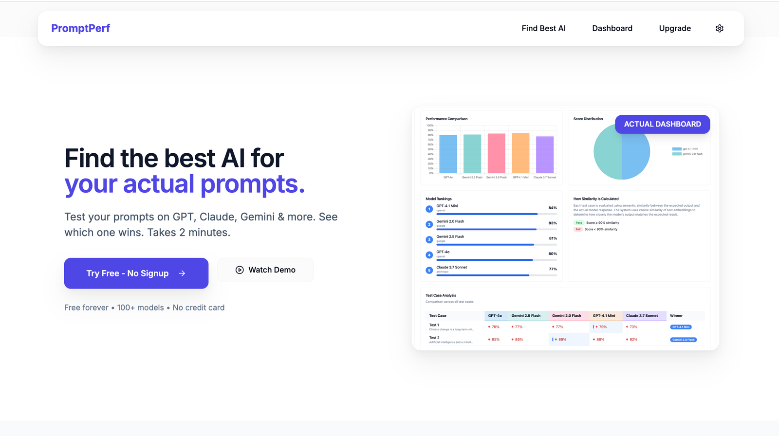 Descrição da ferramenta: PromptPerf 2.0 permite testar prompts em mais de 100 modelos de IA simultaneamente, identificando qual oferece o melhor desempenho para tarefas específicas, com recursos de benchmarking, templates prontos e armazenamento de testes.