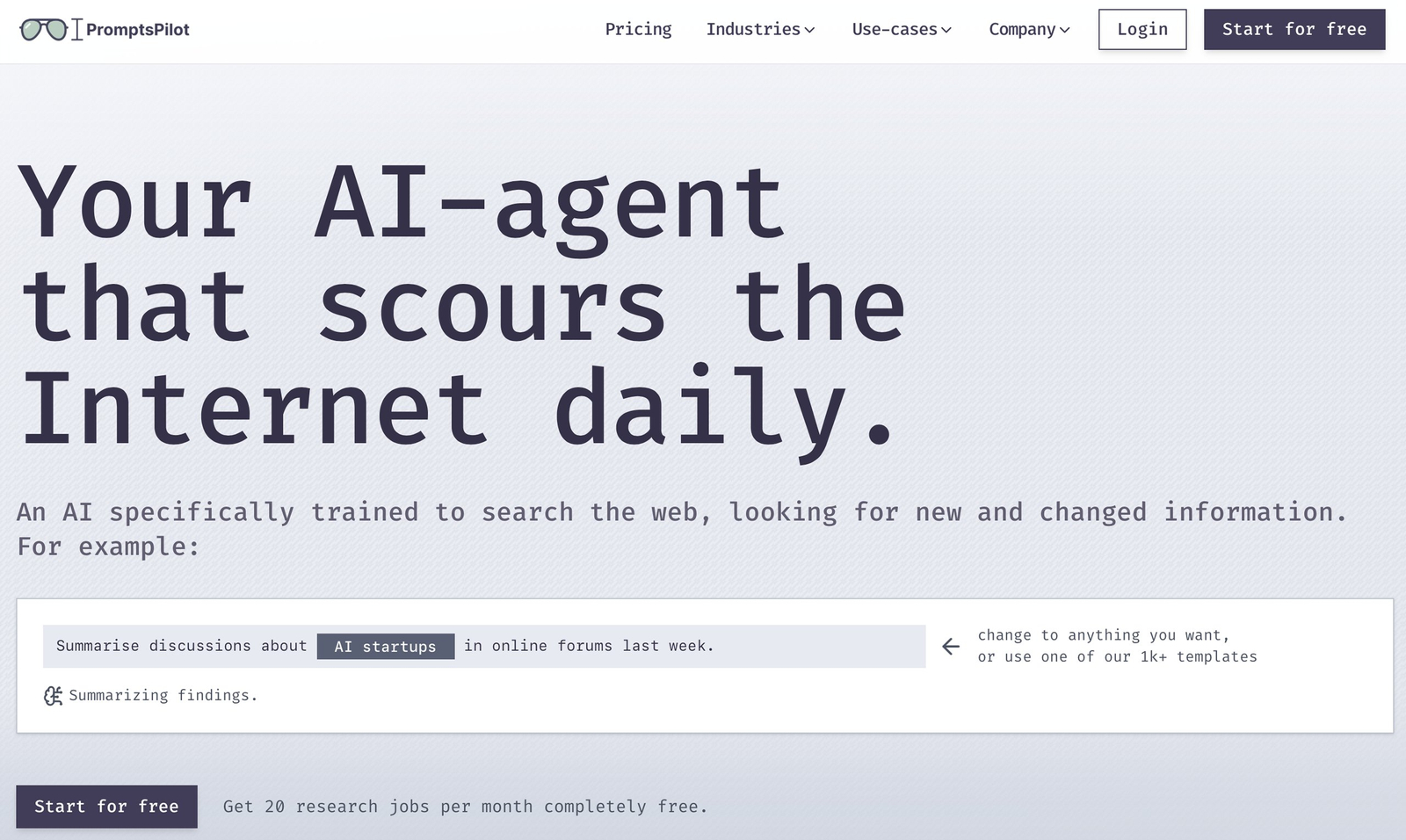 Descrição da ferramenta: Promptspilot é um agente de IA que realiza pesquisas automatizadas na web, monitorando continuamente tendências, resumindo descobertas e entregando insights em tempo real, facilitando o acompanhamento de informações relevantes sem intervenção manual.