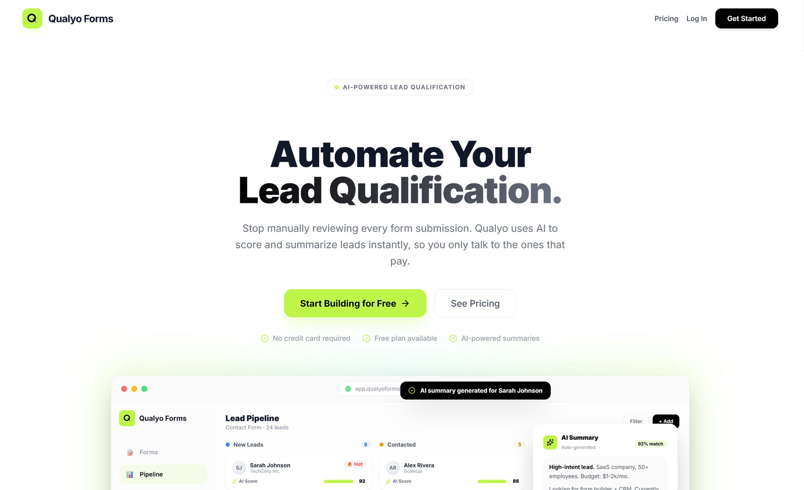 Descrição da ferramenta: Qualyo Forms é uma plataforma de criação de formulários que permite personalizar análises de respostas usando inteligência artificial, facilitando a qualificação de leads e o entendimento do comportamento dos respondentes conforme critérios específicos do usuário.