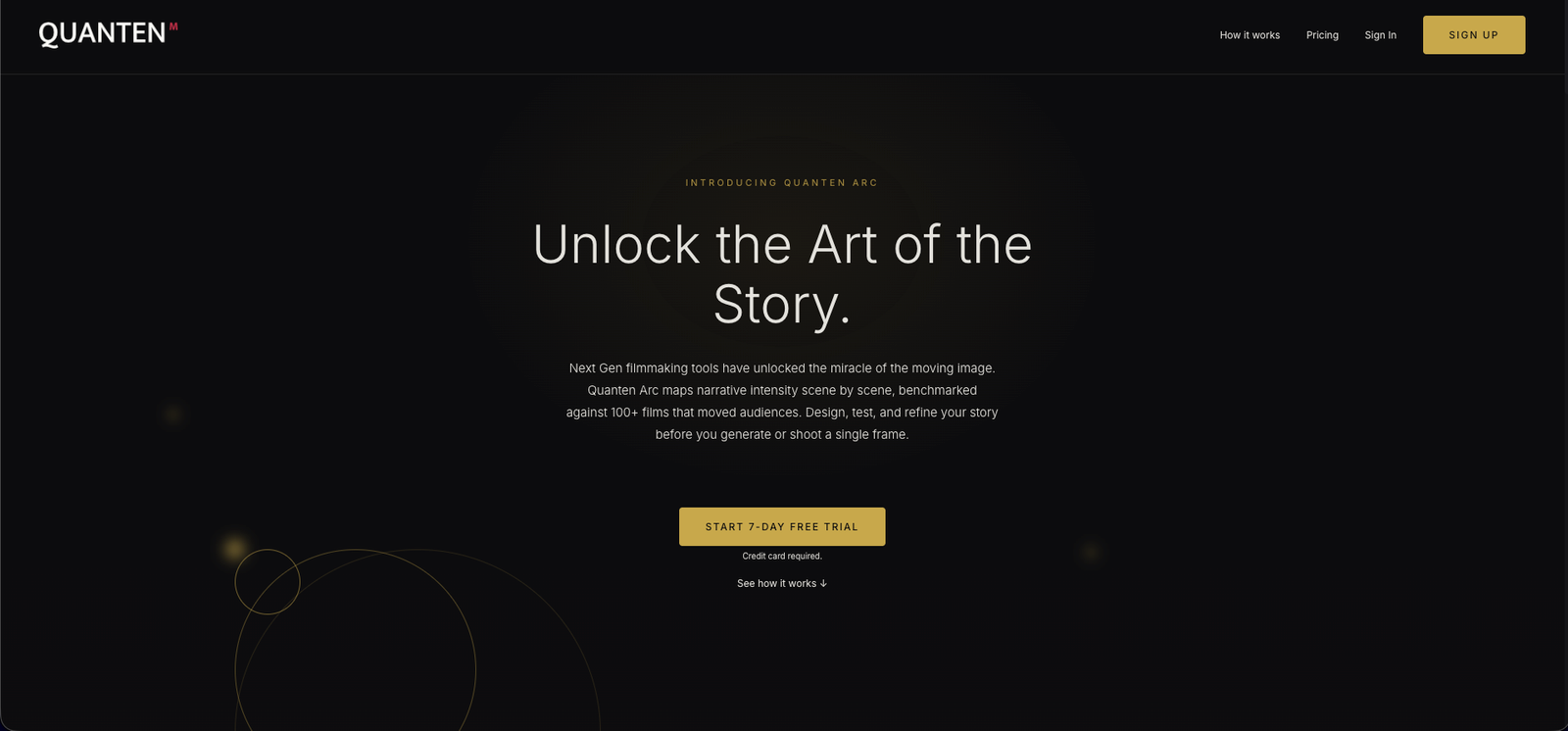 Descrição da ferramenta: Quanten Arc é uma plataforma que utiliza inteligência artificial para auxiliar na construção de arcos narrativos, permitindo o planejamento detalhado de estruturas dramáticas antes da produção cinematográfica.