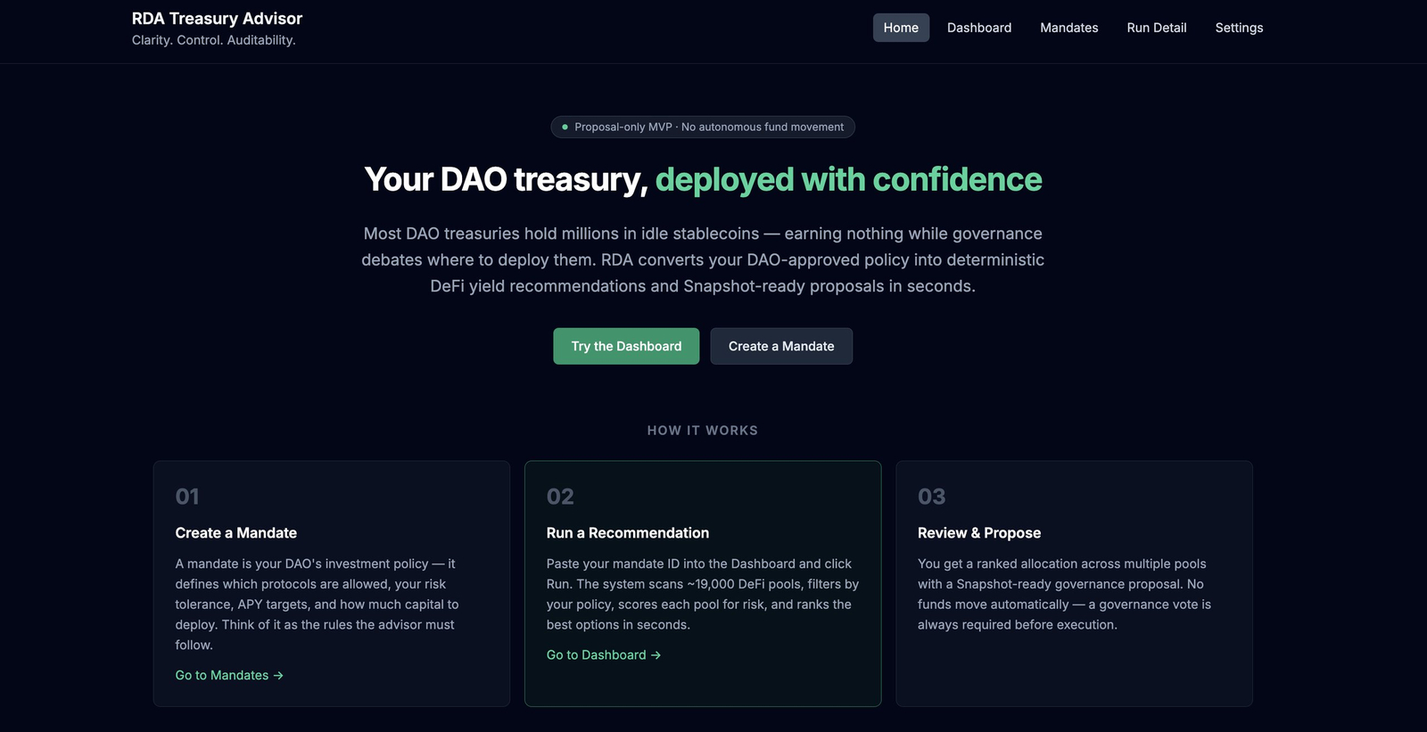 Descrição da ferramenta: RDA — Robo DeFi Advisor é uma ferramenta que analisa pools DeFi, avalia conforme políticas de DAO e gera propostas para otimizar tesourarias, garantindo transparência e alinhamento com governança, sem movimentação de fundos.