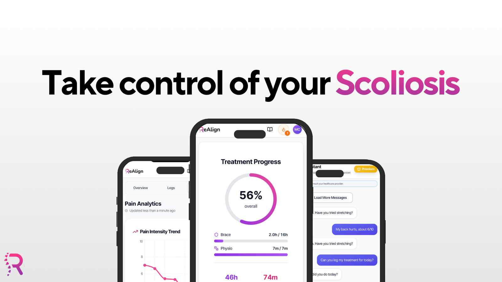 Descrição da ferramenta: ReAlign é uma plataforma que monitora tratamentos de escoliose, visualiza o progresso com análise de IA, conecta usuários a uma comunidade de apoio e oferece interação com inteligência artificial para promover adesão ao tratamento.