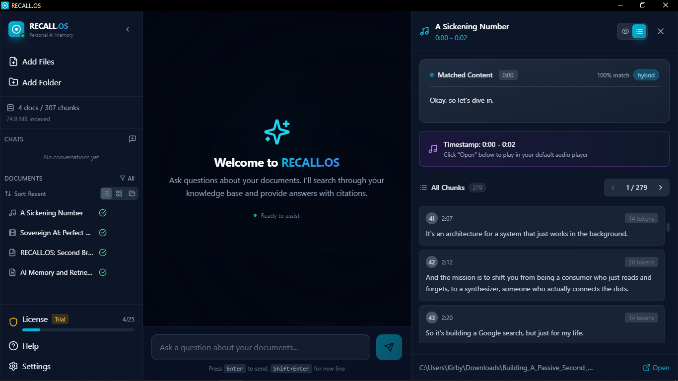 Descrição da ferramenta: Recall.OS é uma ferramenta de busca de inteligência artificial que opera localmente, monitorando pastas e acessando seus arquivos diretamente, garantindo privacidade e respostas precisas com citações específicas dos documentos.