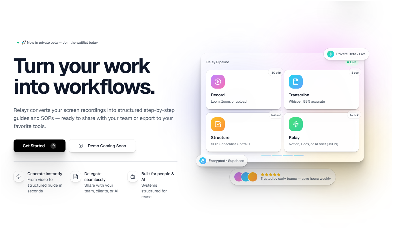 Descrição da ferramenta: Relayr converte gravações de tela em guias passo a passo, facilitando treinamentos, processos e fluxos de trabalho claros, consistentes e facilmente compartilháveis, eliminando a necessidade de vídeos longos ou anotações confusas.
