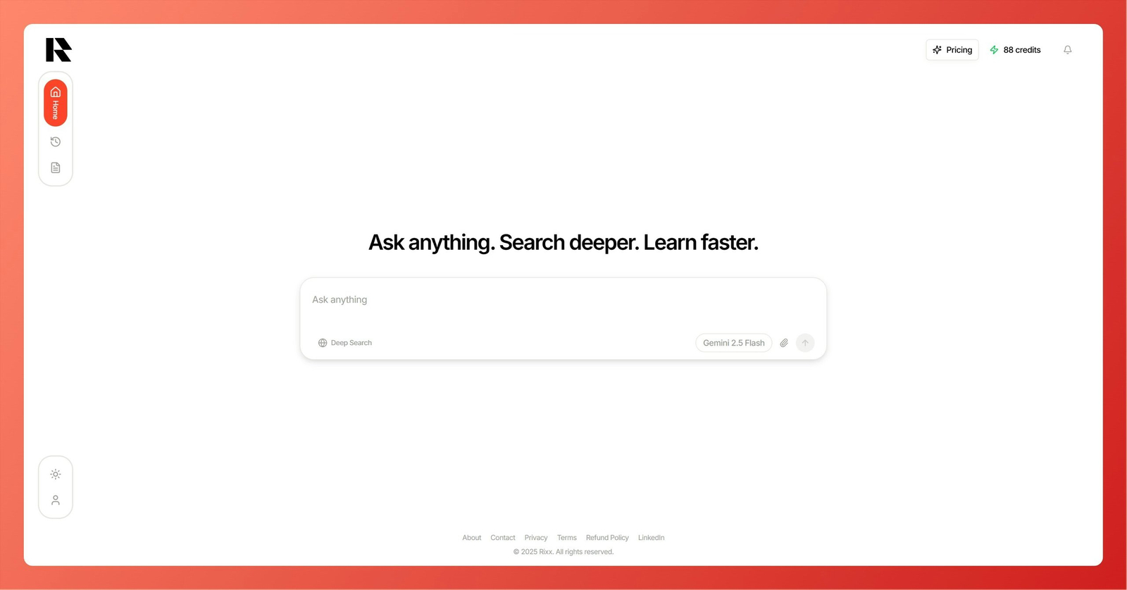 Descrição da ferramenta: Rixx é uma plataforma de pesquisa e análise alimentada por inteligência artificial, que oferece respostas estruturadas, visualizações interativas e recursos de exportação, facilitando a pesquisa aprofundada e a publicação de conteúdos em um fluxo integrado.