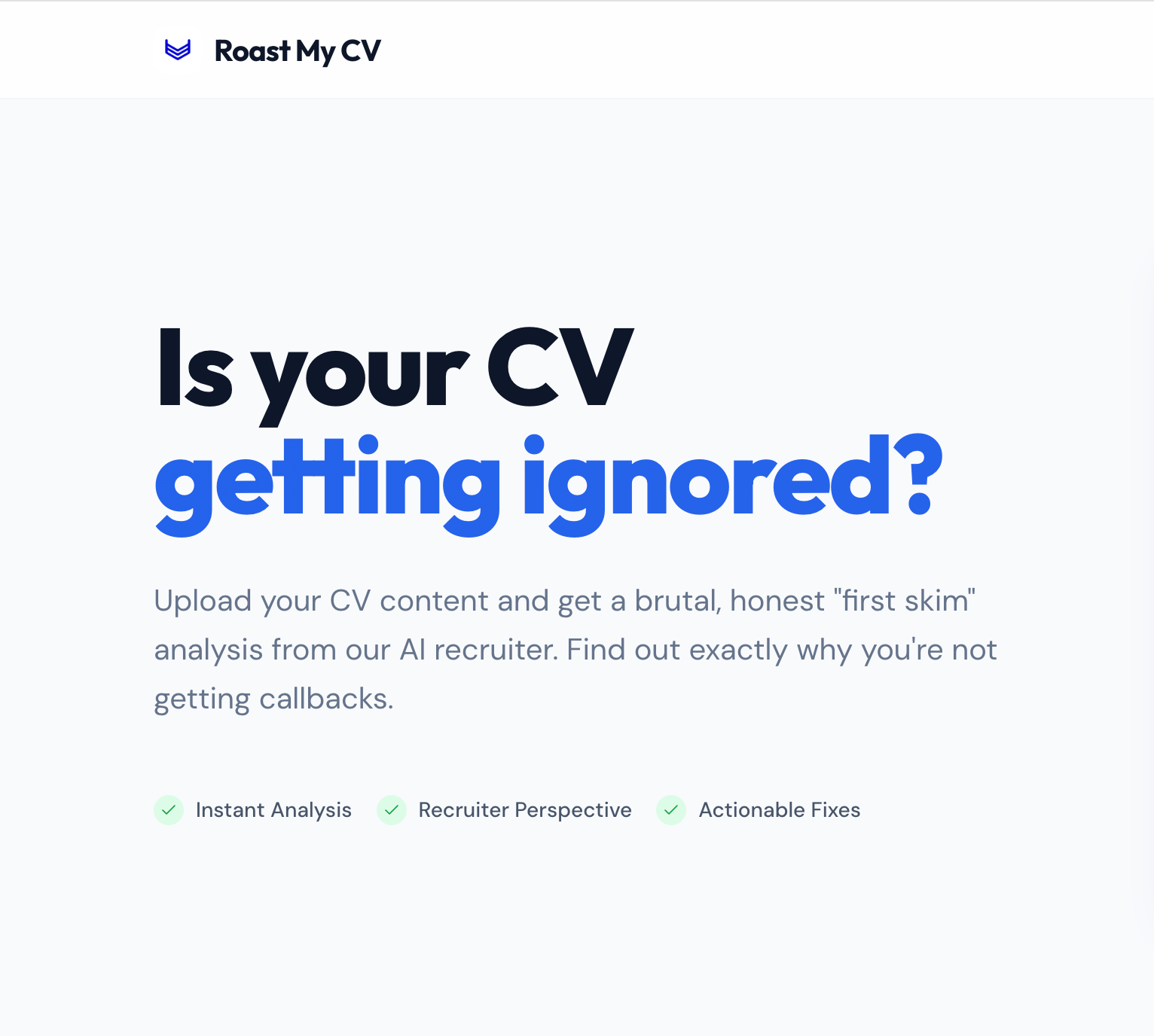 Descrição da ferramenta: Roast My CV oferece feedback direto e honesto sobre currículos, identificando pontos fracos, confusos ou rejeitados por recrutadores, ajudando candidatos a aprimorar seus documentos com sugestões objetivas e acionáveis.