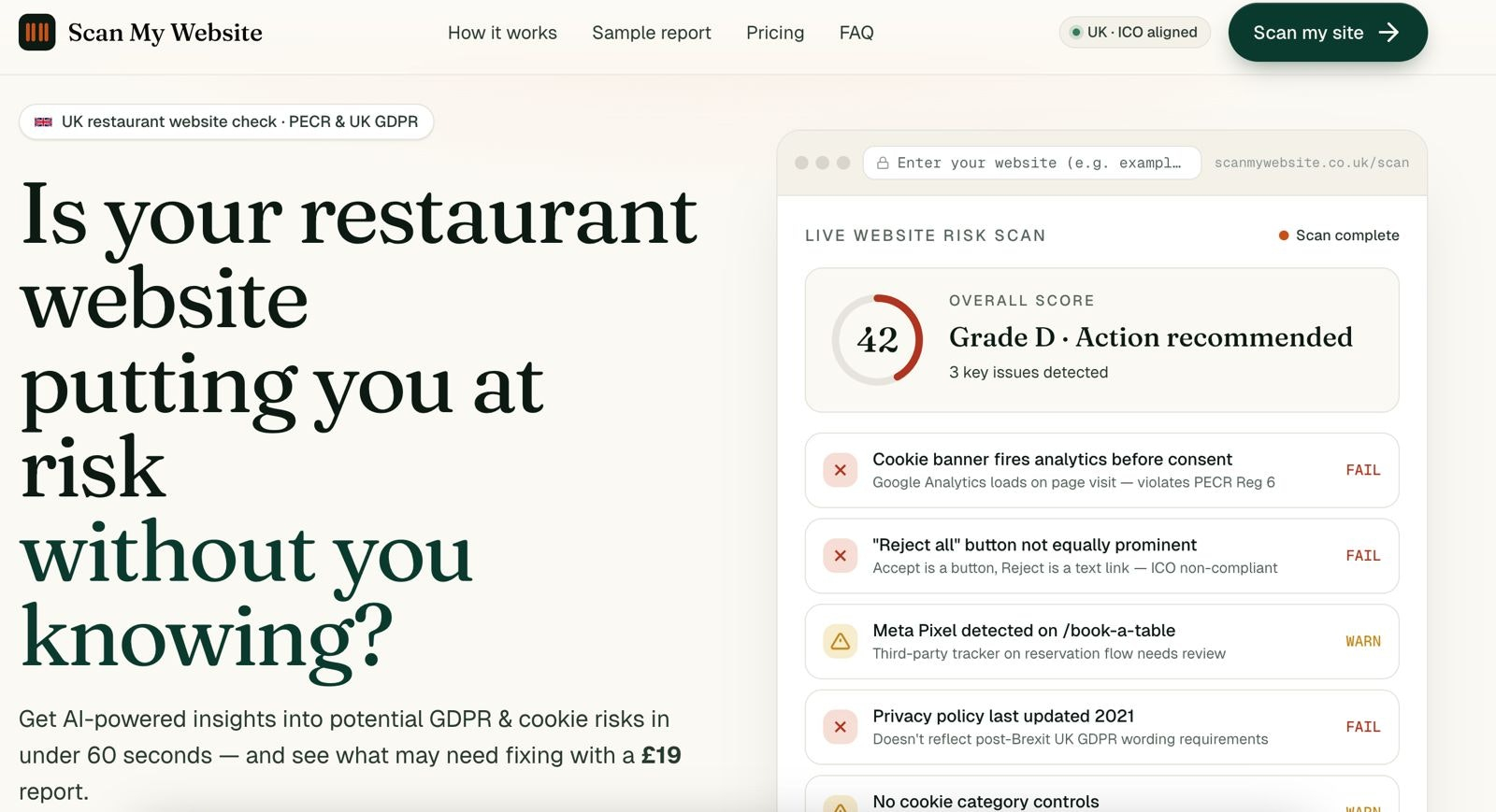 Descrição da ferramenta: Scan My Website é uma ferramenta que permite escanear sites, identificar problemas técnicos e oferecer auditorias rápidas por £19, facilitando a criação de um serviço de análise de websites sem necessidade de codificação.