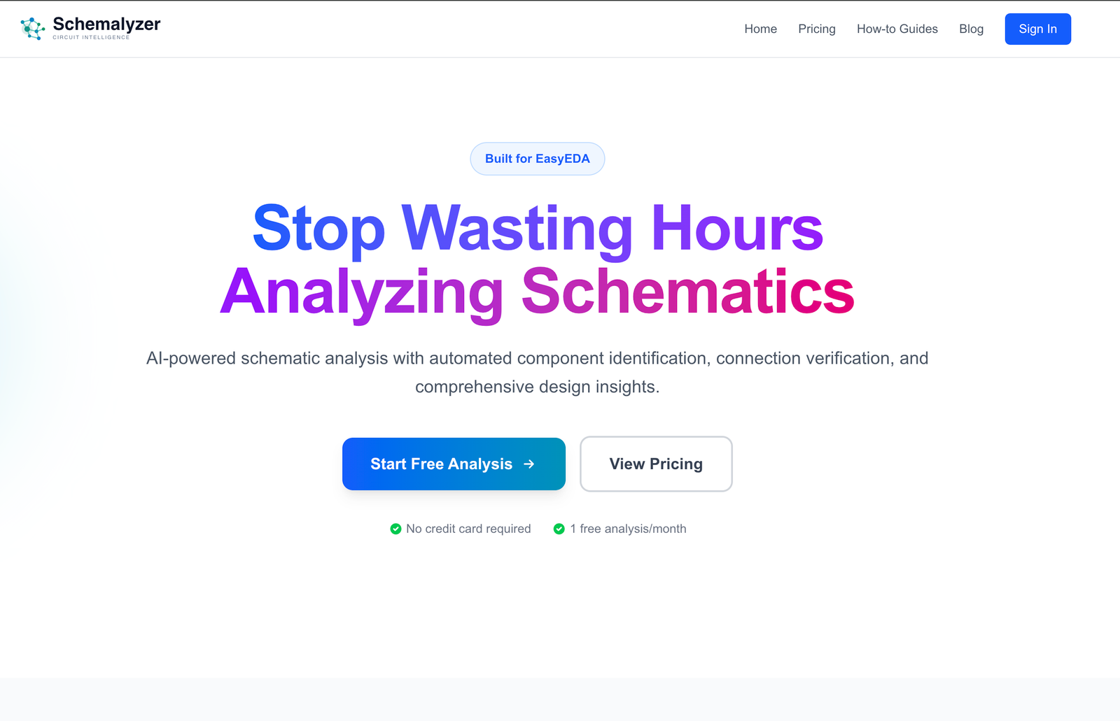 Descrição da ferramenta: Schemalyzer é uma ferramenta de revisão esquemática alimentada por IA para EasyEDA, que analisa arquivos JSON, identifica erros, verifica componentes e fornece recomendações para aprimorar o projeto antes da fabricação da PCB.