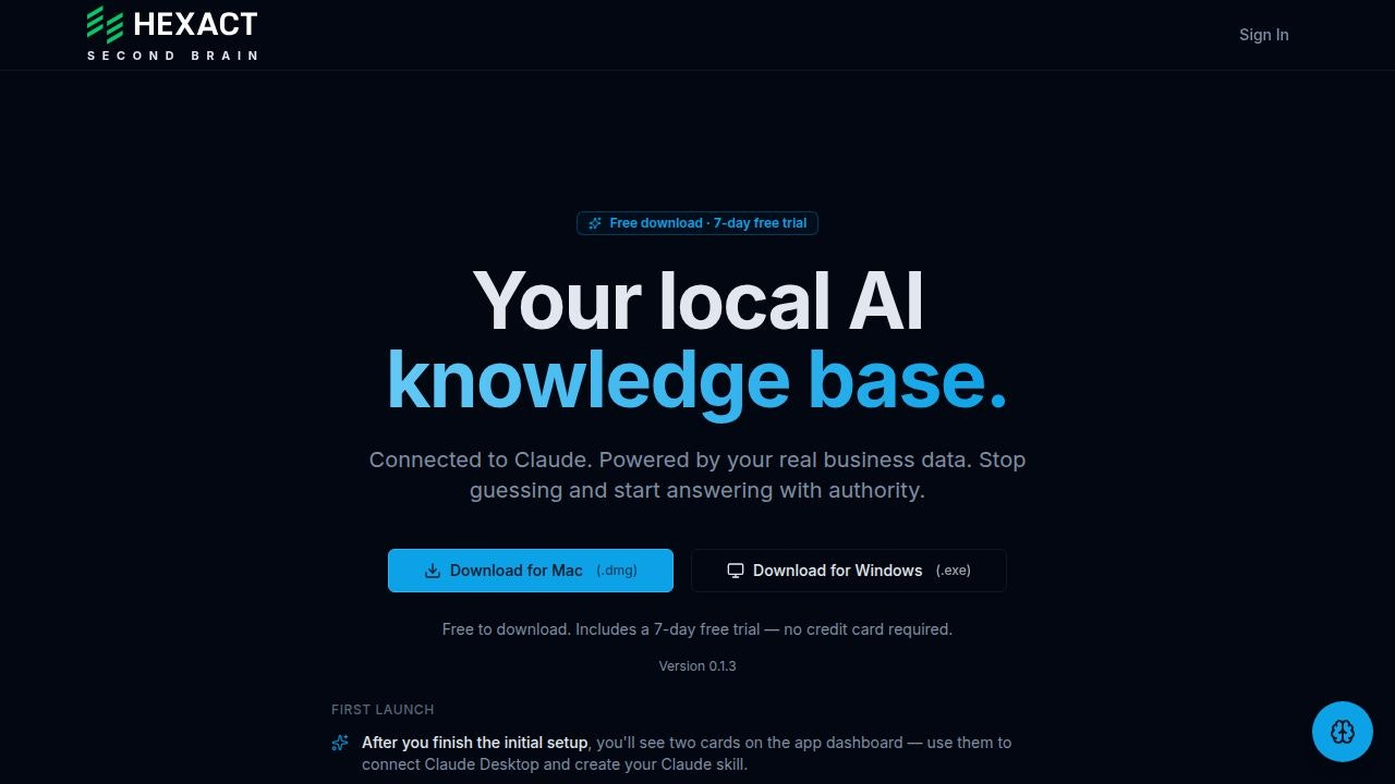Descrição da ferramenta: Second Brain by Hexact é uma aplicação desktop local que armazena informações pessoais, contatos, notas e dados empresariais, permitindo interações com Claude Desktop para leitura e escrita de dados mediante permissão do usuário.