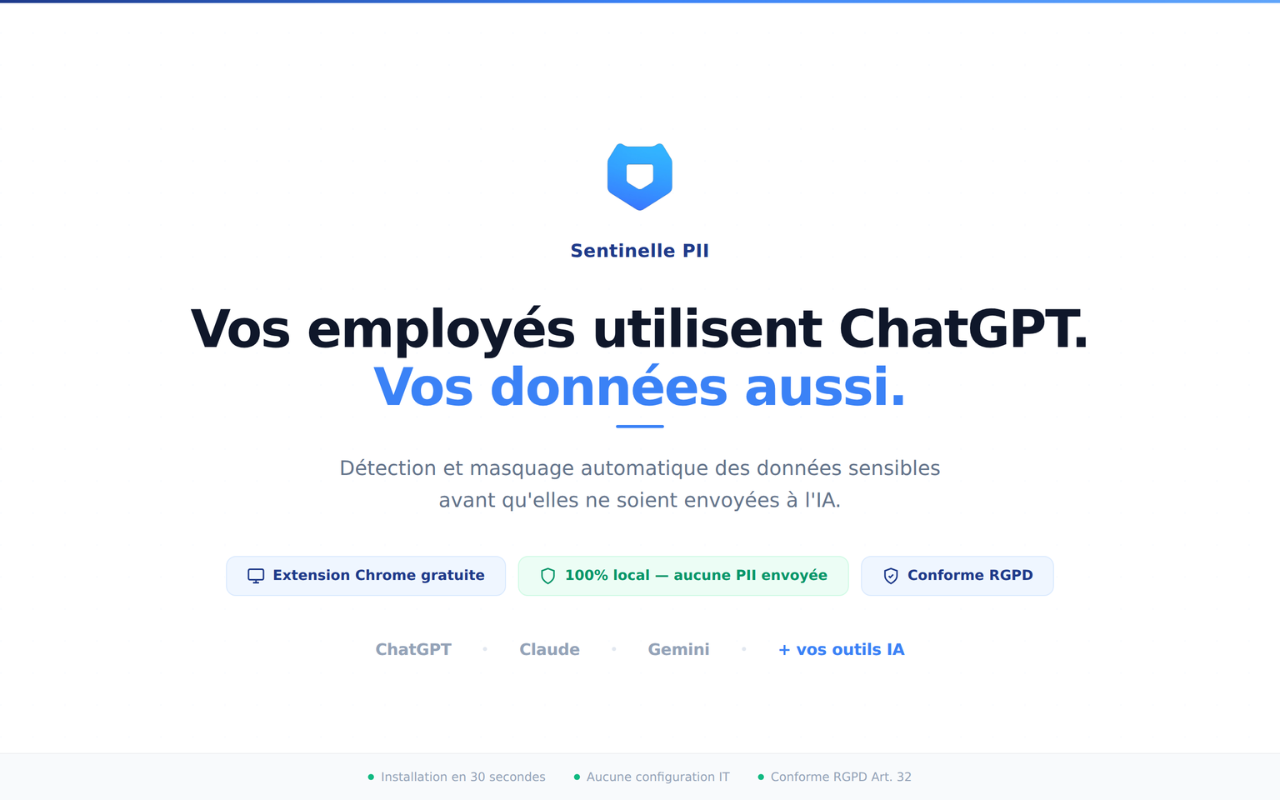 Descrição da ferramenta: Sentinelle PII é uma extensão que detecta e mascara dados pessoais sensíveis em tempo real durante interações com chatbots, garantindo privacidade e conformidade com GDPR, sem que os dados saiam do navegador.