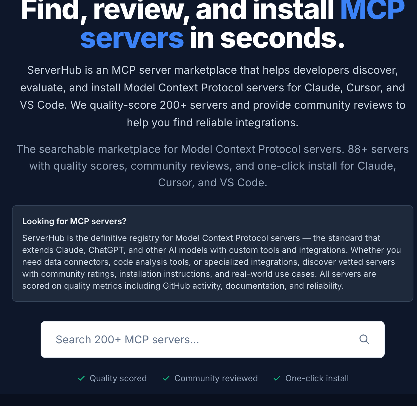 Descrição da ferramenta: ServerHub é uma plataforma que avalia e disponibiliza servidores MCP, facilitando a conexão de ferramentas como Claude, Cursor e VS Code, com configurações de instalação rápidas e avaliações de qualidade baseadas em métricas como estrelas no GitHub e testes.