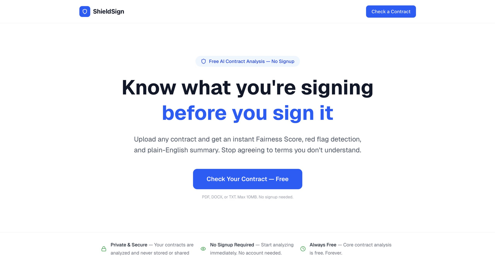 Descrição da ferramenta: ShieldSign é uma ferramenta que analisa contratos em diversos formatos, atribuindo uma pontuação de justiça e destacando cláusulas de risco, facilitando negociações e compreensão do documento em poucos segundos.