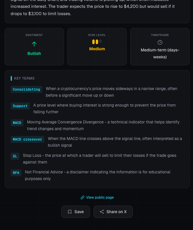 Descrição da ferramenta: SignalDecoder converte sinais de negociação de criptomoedas complexos em linguagem clara e acessível, oferecendo análise de sentimento, avaliação de risco e explicações simplificadas. Disponível como extensão, bot no Telegram e Discord, além de versão web gratuita.