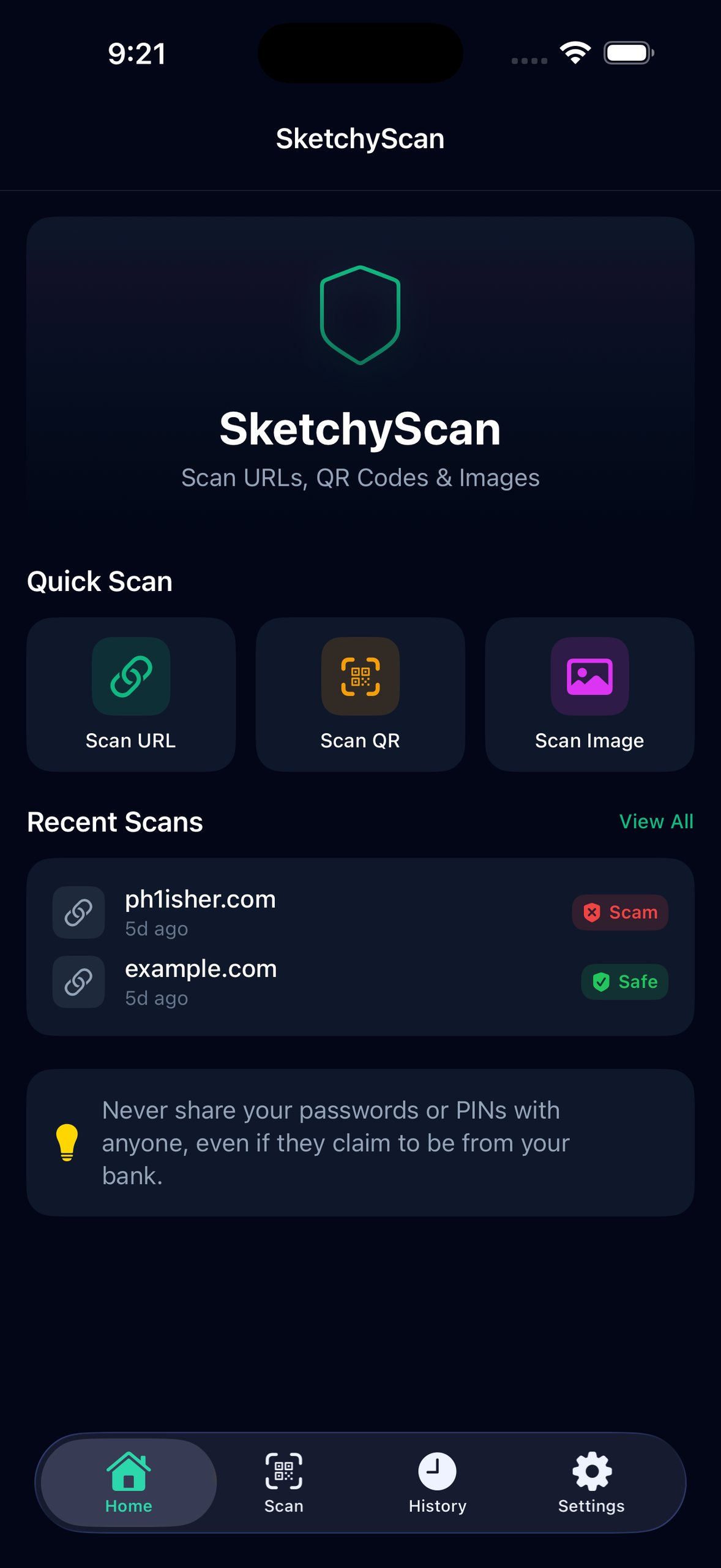Descrição da ferramenta: SketchyScan é uma ferramenta de análise rápida que verifica a segurança de textos, QR codes, links e capturas de tela usando inteligência artificial, identificando ameaças como scams ou vazamentos de dados em segundos.