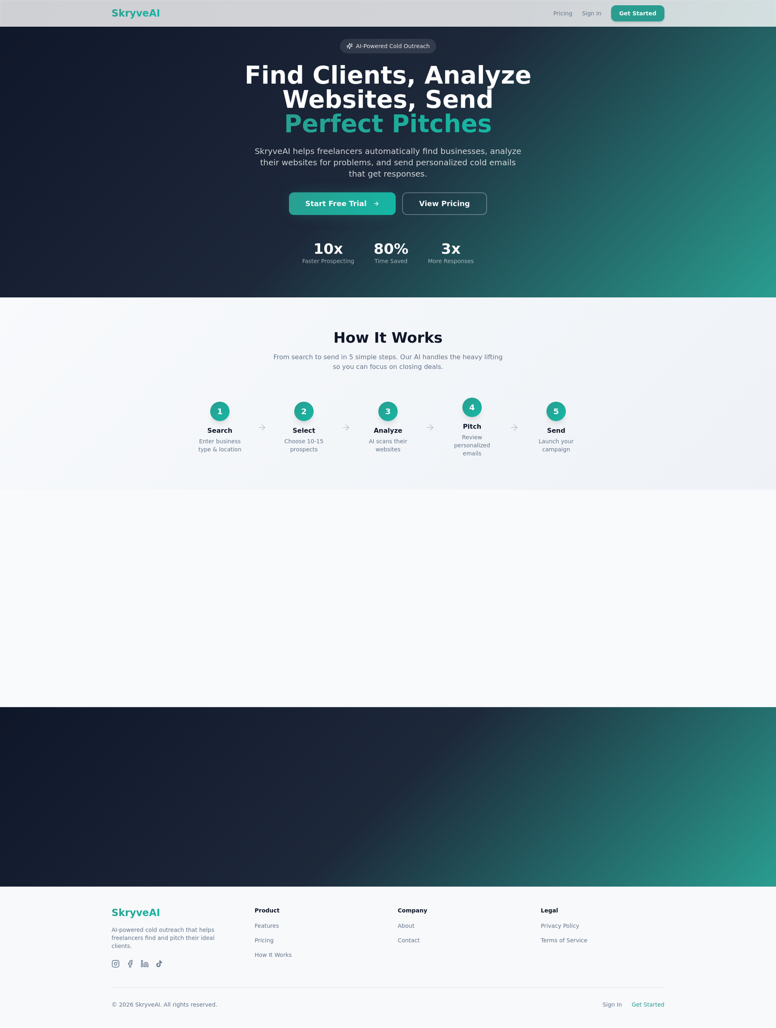 SkryveAI é uma ferramenta alimentada por inteligência artificial que auxilia freelancers na busca de clientes locais, análise de sites, elaboração de propostas, localização de e-mails e envio automatizado de mensagens, otimizando o processo de captação de gigs.