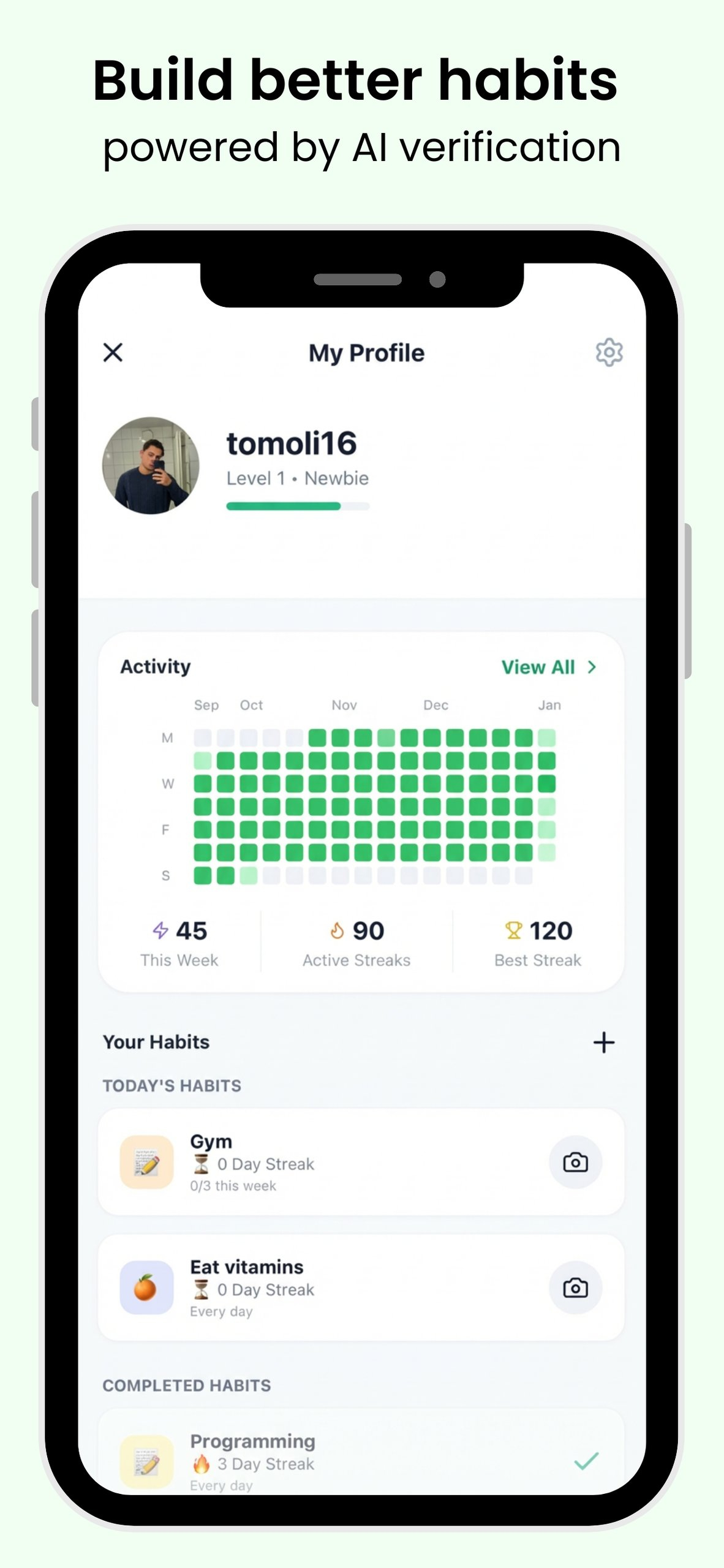 📸 Verificação por foto: Cada hábito exige uma prova fotográfica como confirmação de execução.
