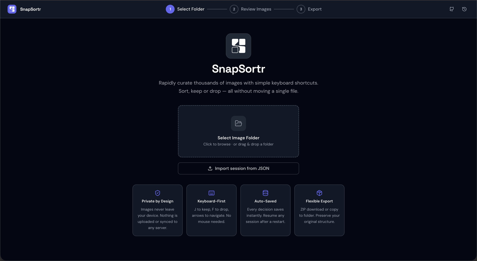 Descrição da ferramenta: SnapSortr é uma ferramenta web rápida para seleção e organização de grandes conjuntos de fotos, permitindo revisar, marcar e exportar imagens localmente no navegador, garantindo agilidade e privacidade no processo.