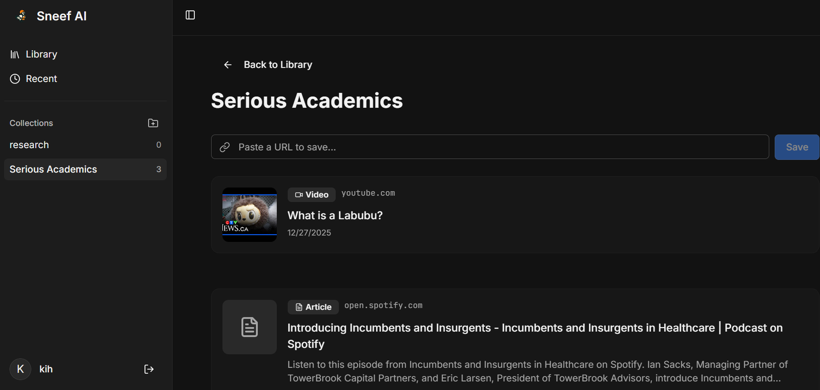 Descrição da ferramenta: Sneef AI é uma plataforma de trabalho com inteligência artificial que organiza artigos, documentos e vídeos, oferecendo resumos, vídeos curtos, gráficos e timelines para facilitar a compreensão e análise do conteúdo.