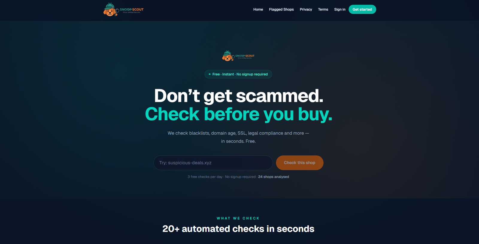 Descrição da ferramenta: SnoopScout realiza mais de 20 verificações automatizadas em lojas online, incluindo detecção de blacklist, status SSL, idade do domínio e conformidade legal, oferecendo uma análise rápida e gratuita para garantir segurança na compra.