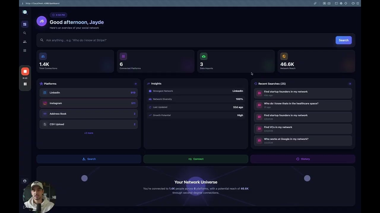 SocialSweep AI é uma ferramenta de busca que analisa sua rede social para identificar conexões relevantes, facilitando networking, viagens ou buscas por expertise específica com respostas instantâneas.