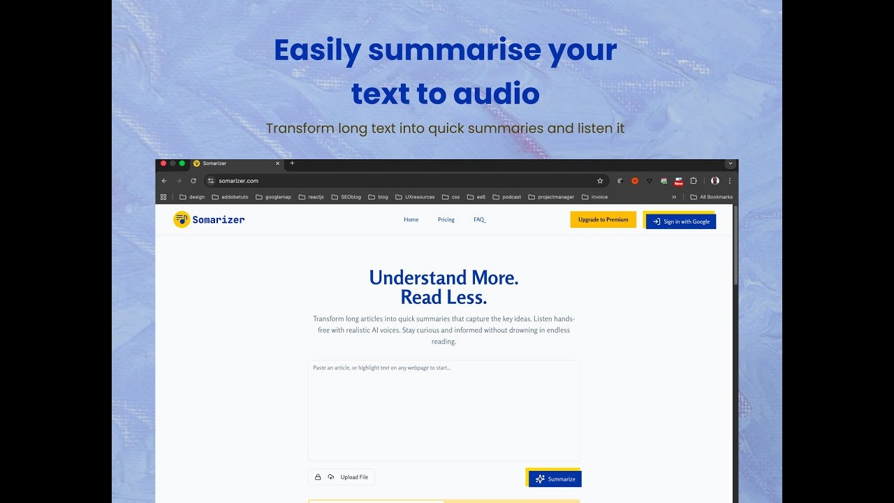 Descrição da ferramenta: Somarizer é uma plataforma que resume textos, PDFs e imagens, destacando informações essenciais, além de converter textos em fala usando inteligência artificial, ideal para quem busca agilidade na leitura e compreensão de conteúdos.