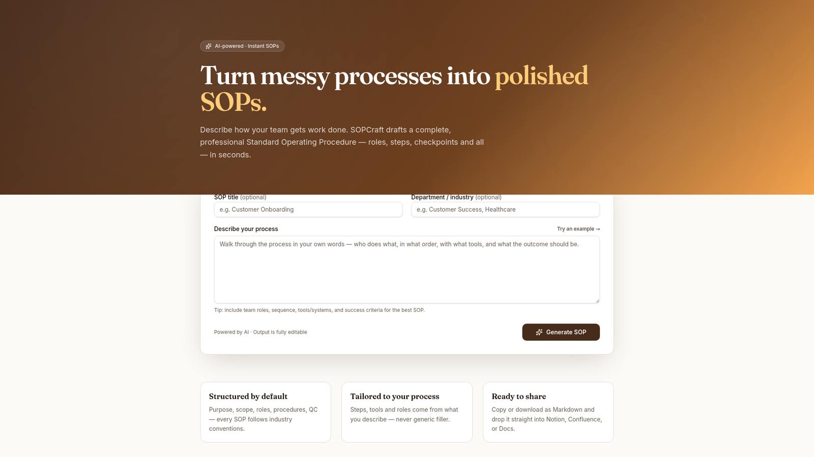 Descrição da ferramenta: SOPCraft é uma ferramenta que gera Procedimentos Operacionais Padrão (POPs) profissionais a partir de descrições de processos empresariais, facilitando a documentação rápida e eficiente sem necessidade de templates ou consultores.