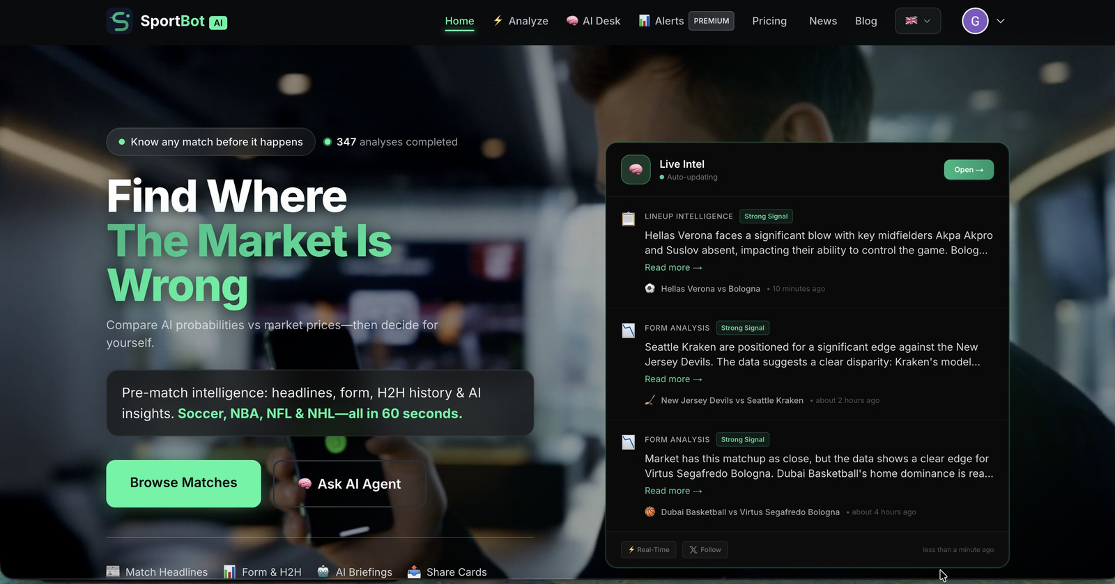 Descrição da ferramenta: SportBot AI é uma plataforma de análise esportiva baseada em inteligência artificial que fornece estimativas de probabilidade, detecção de valor e avaliação de risco para partidas de diversos esportes em apenas 60 segundos.