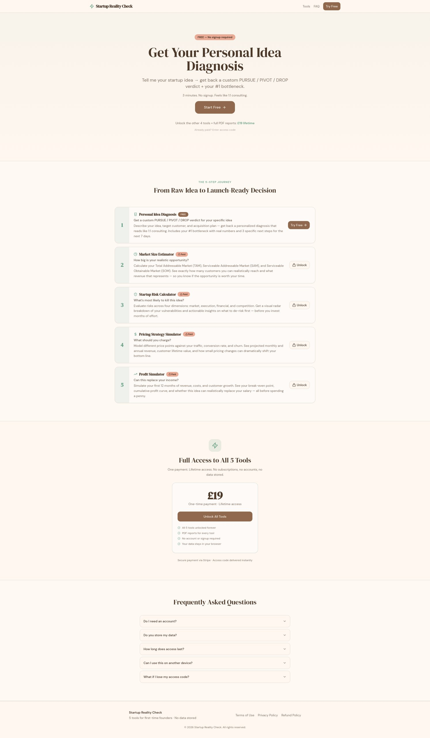 Descrição da ferramenta: Startup Reality Check é uma ferramenta que avalia ideias de startups, fornecendo recomendações personalizadas de seguir em frente, pivotar ou desistir, além de estimar mercado, riscos e lucros em minutos.