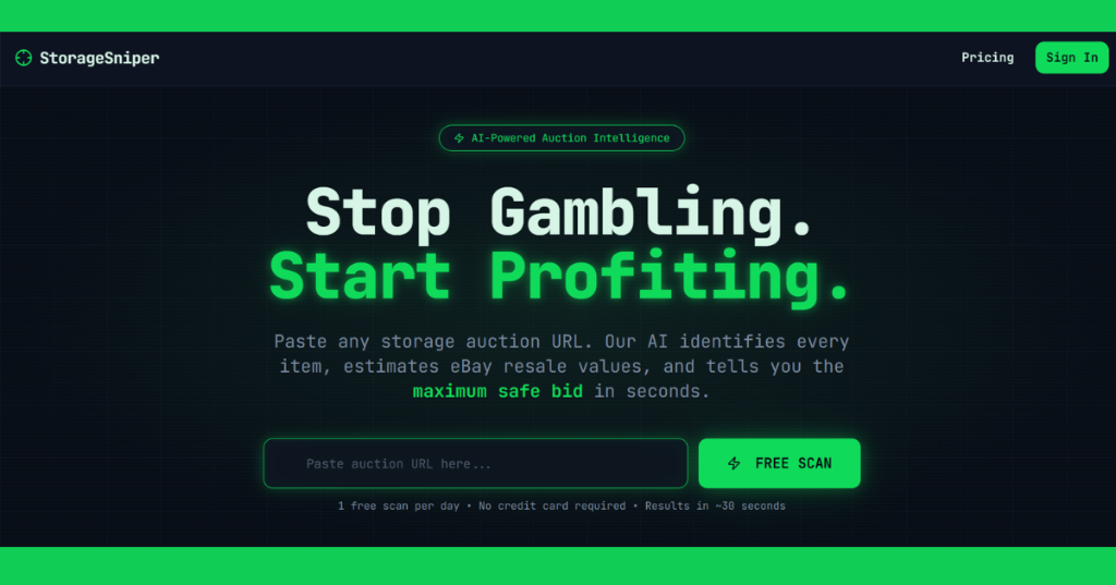 Descrição da ferramenta: StorageSniper é uma ferramenta que utiliza inteligência artificial para escanear anúncios de leilões de armazenamento, identificando itens, estimando valores de revenda no eBay e calculando o lucro potencial em segundos.