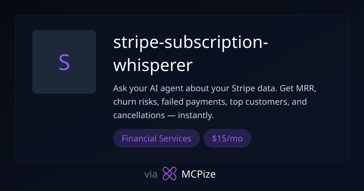 Descrição da ferramenta: Stripe Subscription Whisperer é um servidor MCP de leitura que conecta IA a contas Stripe, permitindo consultas rápidas sobre métricas financeiras e clientes sem necessidade de painéis, otimizando análises e tomada de decisão.