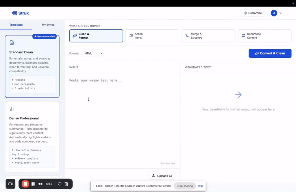 Descrição da ferramenta: Struk é uma ferramenta que converte textos desorganizados e não formatados em conteúdo limpo, estruturado e pronto para uso, suportando formatos como Markdown, HTML ou texto simples. Ideal para escritores e profissionais que desejam otimizar a formatação de textos.