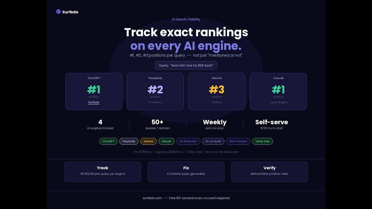 Descrição da ferramenta: Surfedo é uma plataforma que analisa posições de busca, identifica motivos pelos quais concorrentes superam sua classificação e fornece soluções rápidas para melhorar seu desempenho nos motores de busca com dados verificáveis.