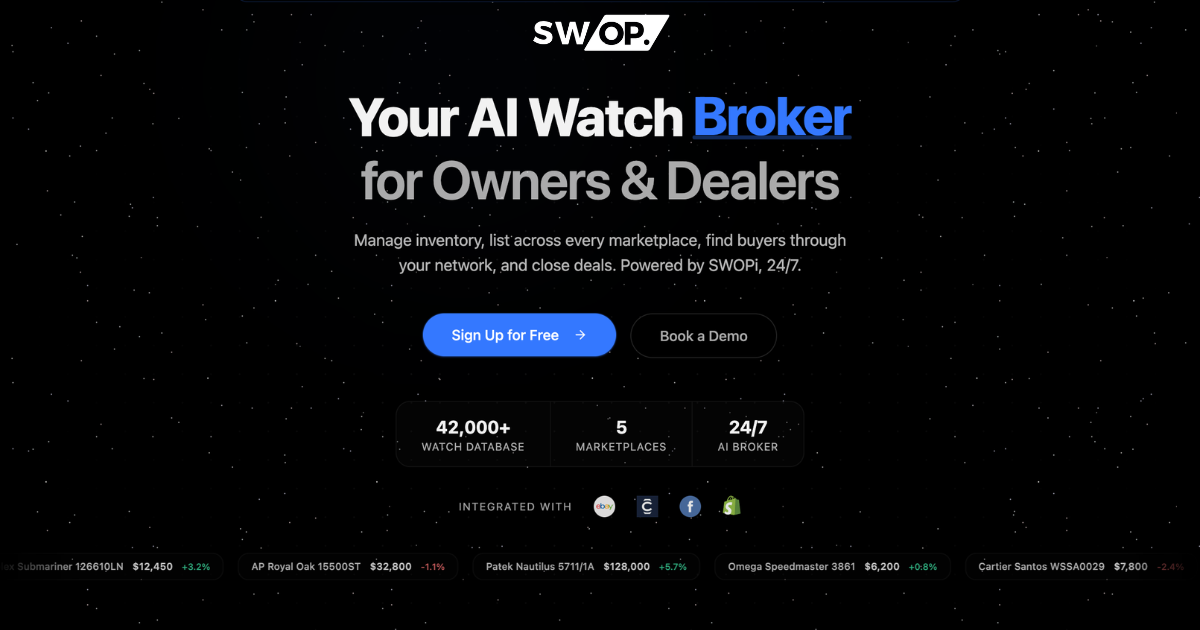 Descrição da ferramenta: SWOP é uma plataforma de corretagem baseada em inteligência artificial que conecta vendedores, colecionadores e proprietários de relógios de luxo autênticos, facilitando negociações, listagens cruzadas e transações seguras com suporte a múltiplas plataformas.