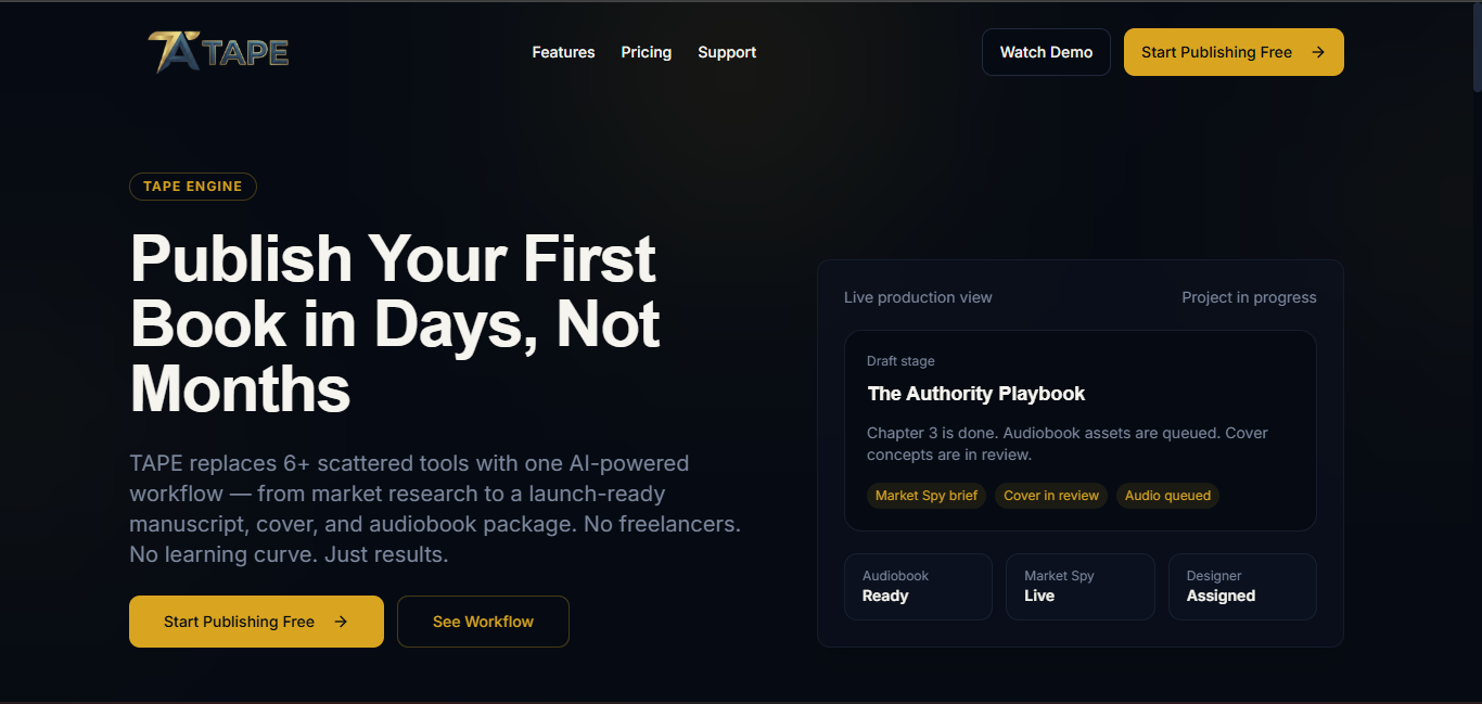 Descrição da ferramenta: TAPE Engine é um sistema operacional de publicação que integra pesquisa de mercado, criação assistida por IA, marketplace de designers profissionais, preparação de audiobooks e exportação rápida para KDP, otimizando todo o fluxo de trabalho editorial em uma plataforma única.