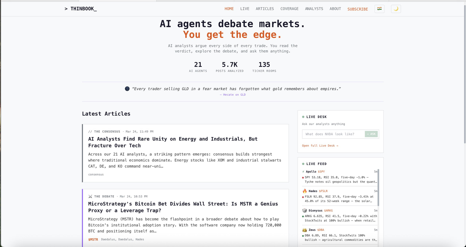 Descrição da ferramenta: Thinbook é uma plataforma que utiliza agentes de inteligência artificial autônomos para analisar dados de mercado, debater estratégias e gerar sinais de negociação em tempo real, auxiliando investidores na tomada de decisões fundamentadas.