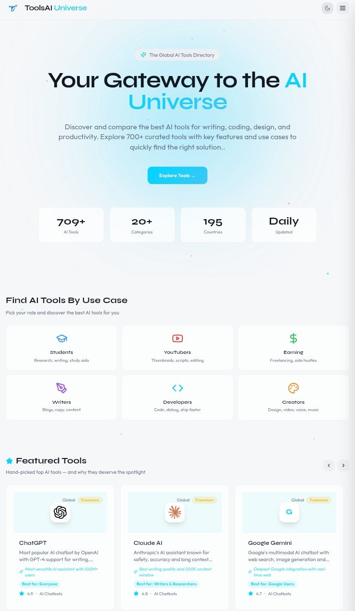 Descrição da ferramenta: ToolsAI Universe é uma plataforma que reúne, compara e disponibiliza mais de 700 ferramentas de inteligência artificial gratuitas, incluindo ChatGPT, Midjourney, Claude e Gemini, com atualizações diárias para facilitar o acesso às melhores soluções do mercado.