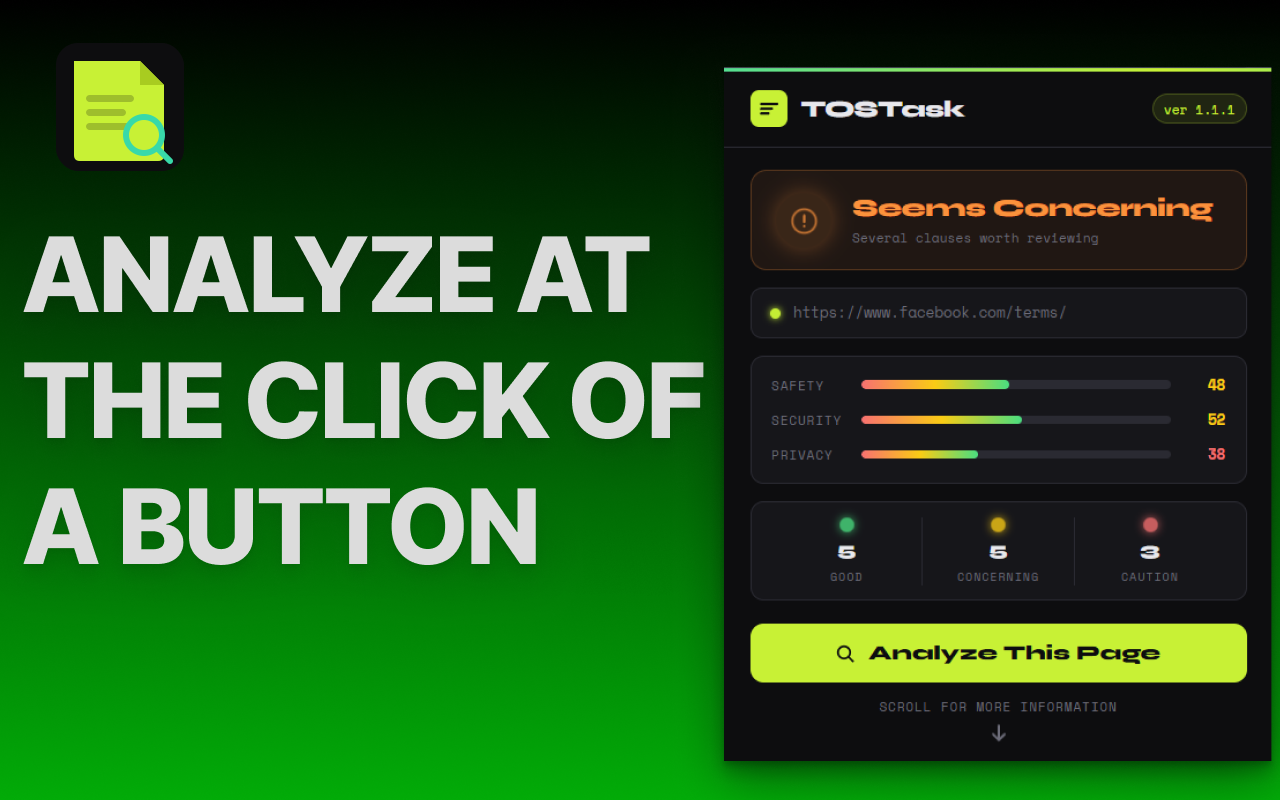 Descrição da ferramenta: TOSTask é uma extensão que avalia e classifica Termos de Serviço e documentos legais usando inteligência artificial, fornecendo análises detalhadas, pontuações em segurança, privacidade e segurança, além de revisões jurídicas automatizadas com um clique.