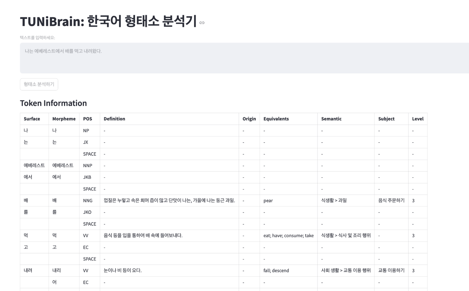 Descrição da ferramenta: O TUNiBrain-Korean Morphological Analyzer é uma ferramenta avançada que combina aprendizado profundo e dicionários para análise morfológica do coreano, identificando sentidos, nomes próprios e fornecendo traduções precisas de tokens.