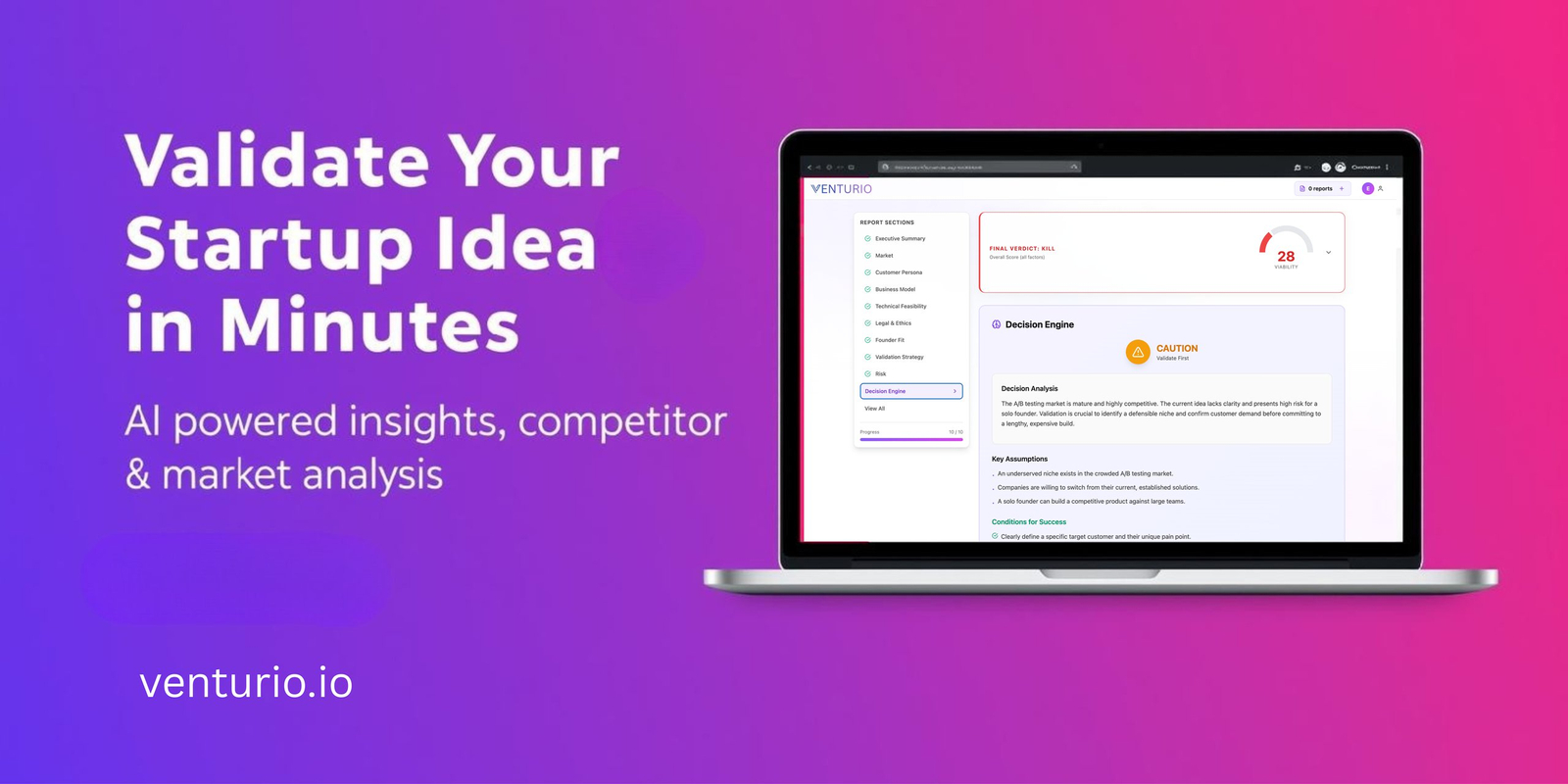 Descrição da ferramenta: Venturio é uma plataforma que utiliza inteligência artificial para validar ideias de startups, analisando demanda de mercado, concorrência, riscos e projeções financeiras em minutos, ajudando empreendedores a evitar custos elevados com falhas.