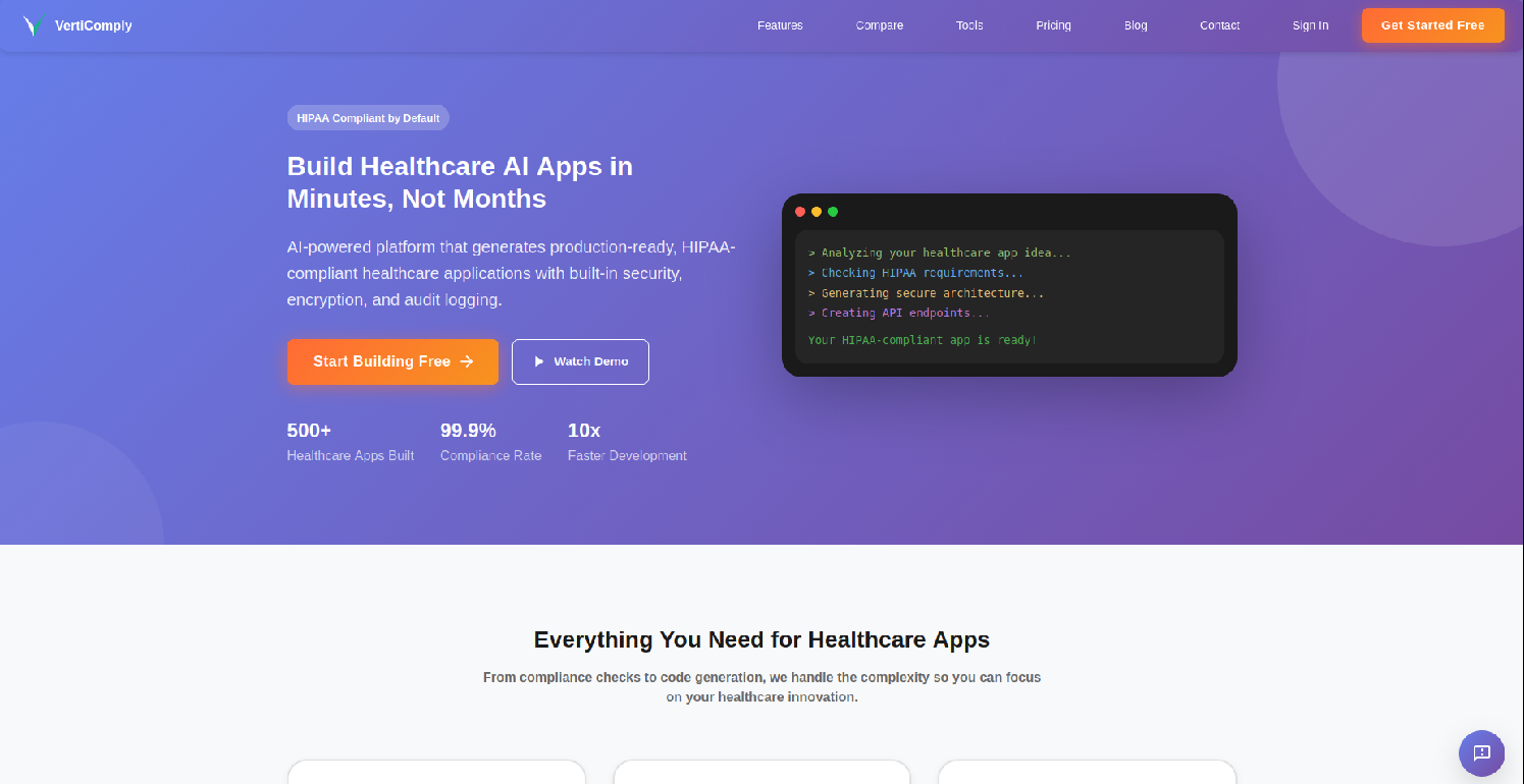 Descrição da ferramenta: VertiComply é uma plataforma de criação de aplicativos de saúde sem necessidade de código, que gera aplicativos compatíveis com regulamentações como HIPAA, GDPR e FHIR, a partir de descrições em linguagem natural, acelerando o desenvolvimento e garantindo conformidade.