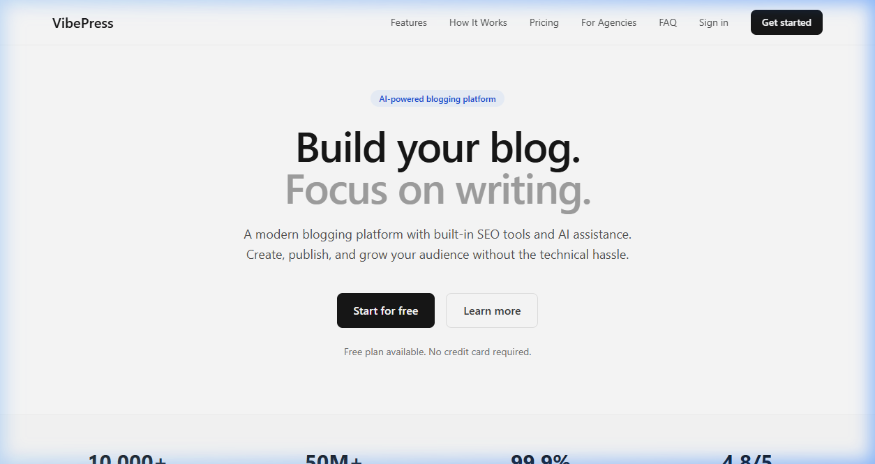 Descrição da ferramenta: VibePress é uma plataforma de criação de blogs otimizada para SEO, com geração de conteúdo por inteligência artificial, análises integradas, suporte a domínios personalizados e editor intuitivo de arrastar e soltar.