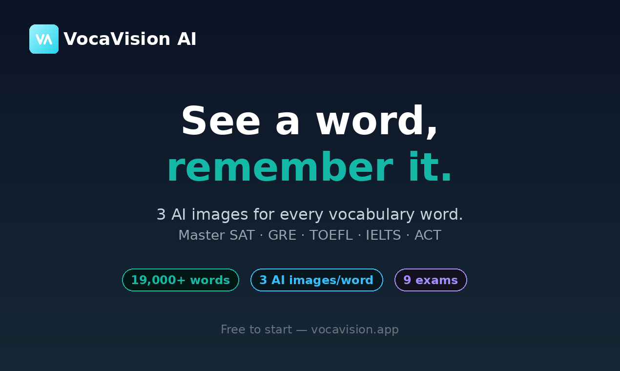 VocaVision AI gera três imagens exclusivas por palavra de vocabulário, facilitando a memorização através de conceitos visuais, mnemônicos e rimas, abrangendo mais de 19.000 termos utilizados em exames como SAT, GRE, TOEFL, IELTS e ACT.
