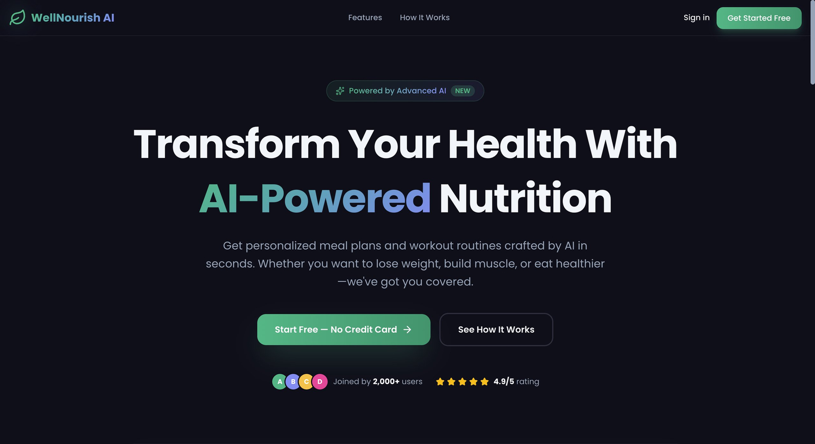 Descrição da ferramenta: WellNourish AI é uma plataforma que fornece planos de refeições, rotinas de exercícios e orientações nutricionais personalizadas, utilizando inteligência artificial para adaptar recomendações às metas, preferências e restrições alimentares do usuário.