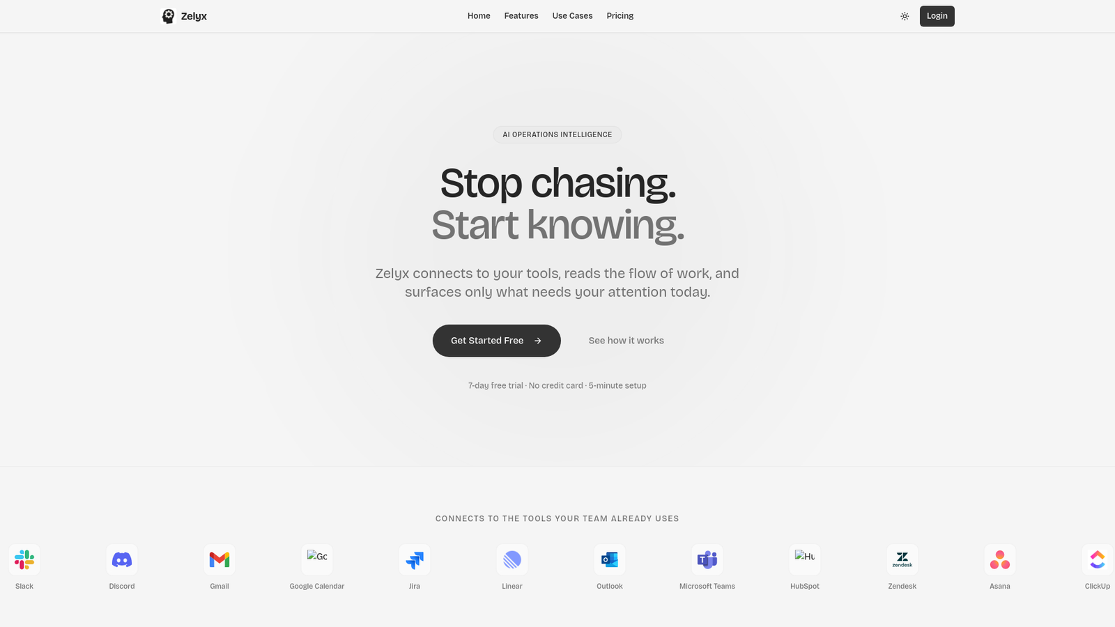Descrição da ferramenta: Zelyx é uma camada operacional que integra múltiplas plataformas, identificando compromissos, bloqueios e tarefas sem proprietário, permitindo ações rápidas e eficazes para fechar ciclos de trabalho sem necessidade de dashboards ou notificações.