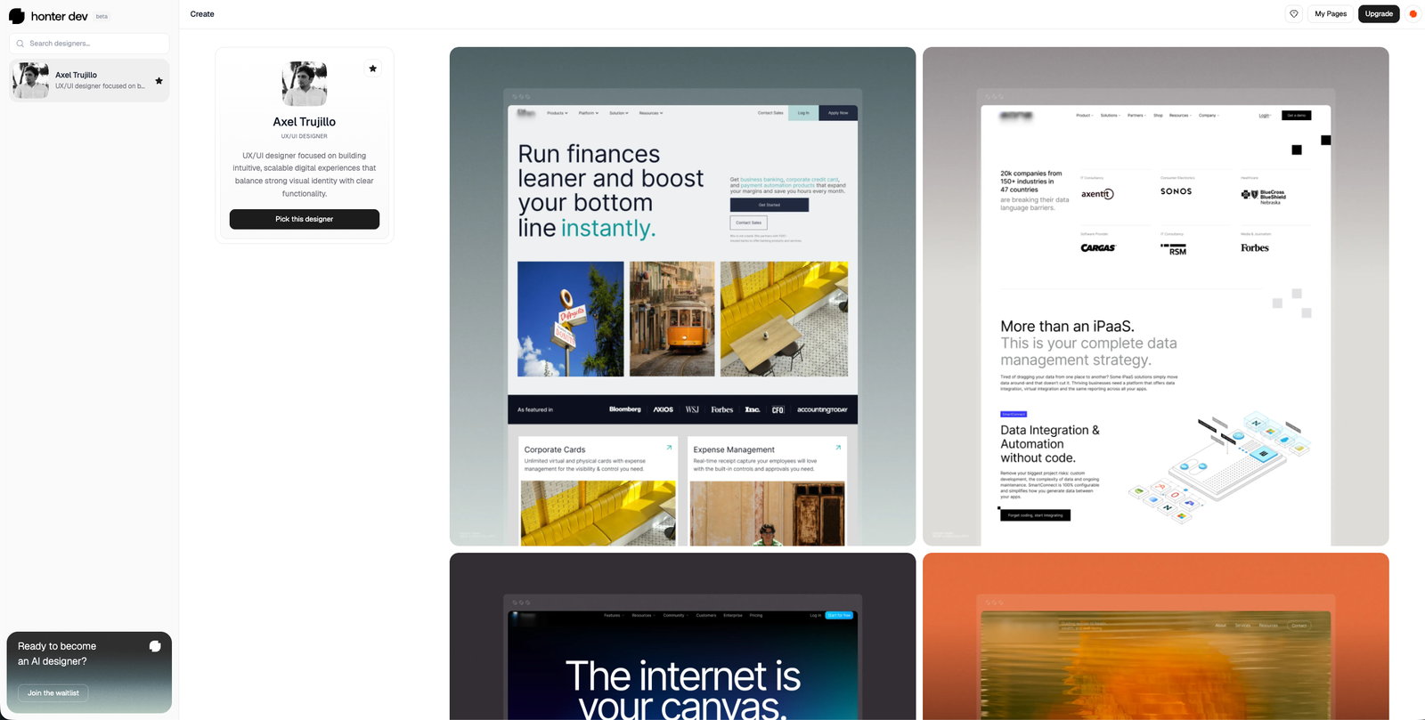 Descrição da ferramenta: Honter é uma plataforma que utiliza inteligência artificial para criar páginas de destino personalizadas, extraindo estilos de designers reais e gerando layouts completos em segundos, promovendo a monetização dos estilos compartilhados.