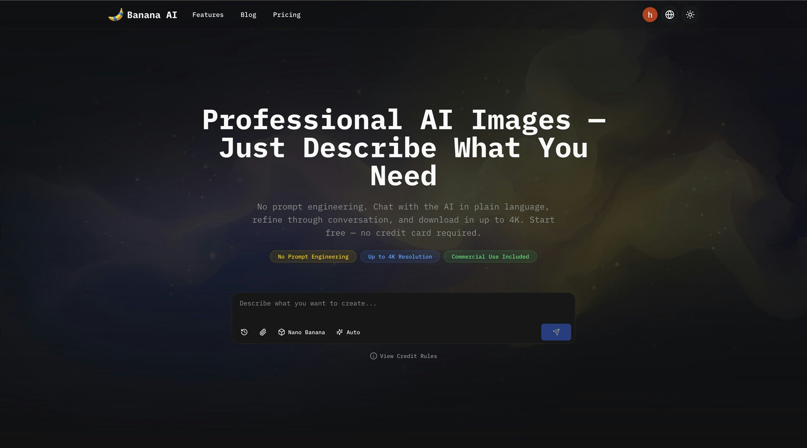 Descrição da ferramenta: Banana AI converte conversas em imagens de alta qualidade, permitindo descrições detalhadas e refinamento contínuo. Oferece resolução 4K, suporte a múltiplos idiomas e modelos variados para resultados precisos e versáteis.