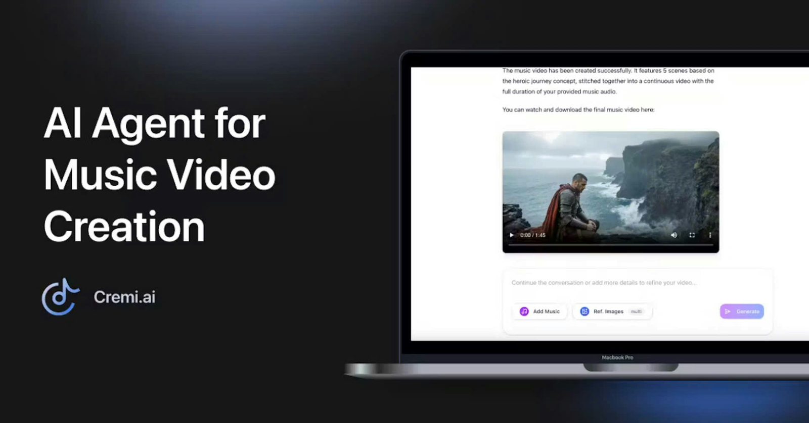 Descrição da ferramenta: Cremi.AI é uma plataforma que converte músicas em vídeos musicais emocionantes, utilizando inteligência artificial para criar narrativas visuais cinematográficas de forma rápida e intuitiva.