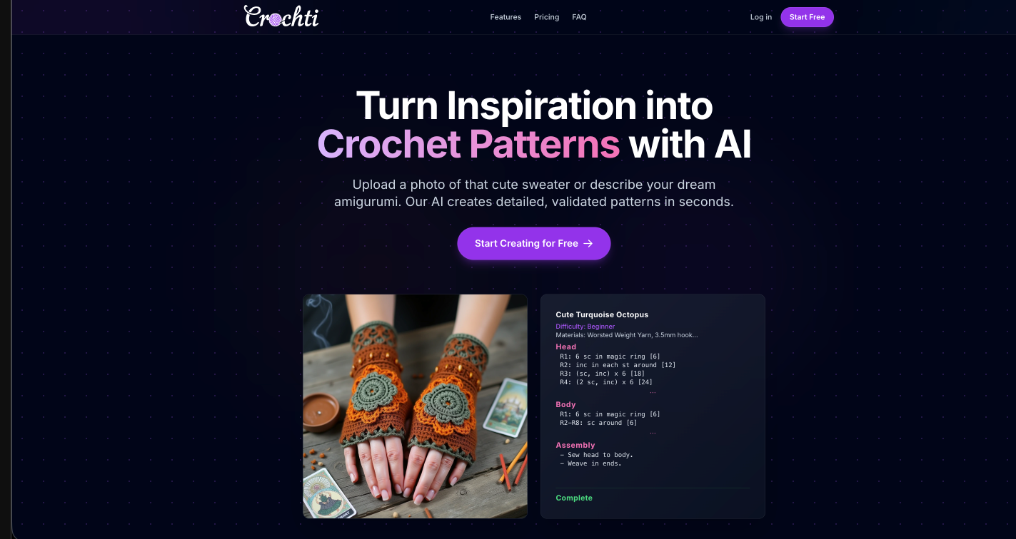 Descrição da ferramenta: Crochti é uma plataforma alimentada por inteligência artificial que converte ideias em padrões de crochê profissionais, facilitando o processo de design e gerando visuais de alta qualidade para diversos propósitos.
